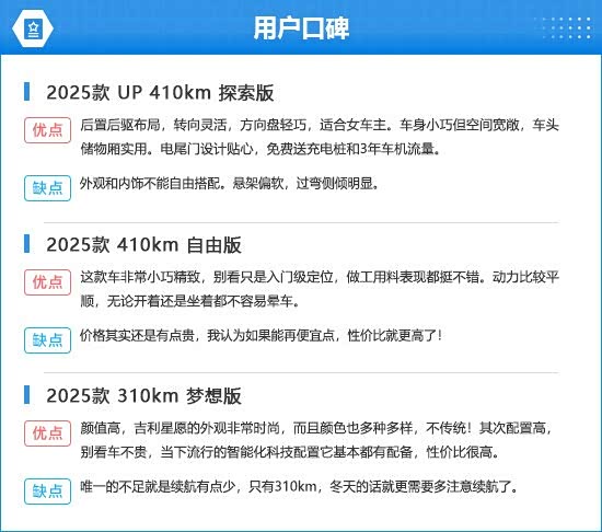 在用户口碑中,多数消费者对吉利星愿的空间、配置以及动力表示满意,不过也有部分消费者反映悬架偏软、价格偏贵、续航不足等问题。