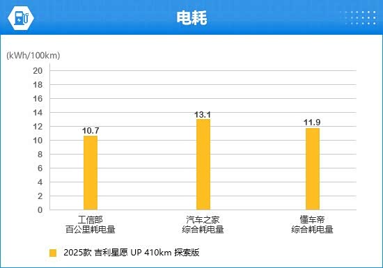 2025款吉利星愿的工信部百公里耗电量为10.7kWh/100km。通过对比两大汽车垂直媒体的测试数据来看,均略高于工信部数据。