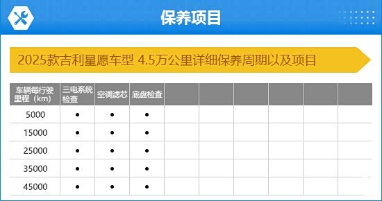 2025款吉利星愿可享受六年或15万公里整车质保;三电系统首任车主终身质保/非营运(责任免除条款以官方为准)。根据保养手册来看,吉利星愿首保时间在购车后3个月或5000公里内(以先到为准),后续每10000公里或1年保养一次。由于是纯电动车,所以保养内容比较简单,每次保养需进行三电系统检查、空调滤芯更换以及底盘检查。