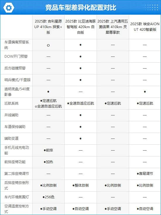 与竞品车型相比,2025款吉利星愿虽然电动机总功率和CLTC纯电续航里程均不是最拔尖的,但整体表现也处于主流水平。而在配置方面,2025款吉利星愿侧重点在舒适性配置方面,其独享前排手机无线充电、前排座椅加热以及256色车内环境氛围灯,这些配置均是消费者比较看重的功能。相比之下,2025款上汽通用五菱缤果和2025款埃安AION UT配置表现稍显逊色。