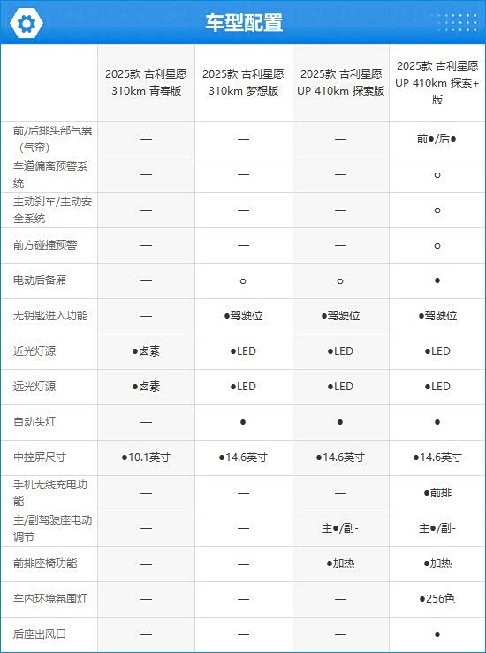 通过配置对比发现,2025款吉利星愿提供两种电动机功率和两种续航版本可选,比较多元化。而在配置方面,每款车型之间差异并不大,中配车型主要增加了自动头灯、驾驶位无钥匙进入功能。高配车型则主要增加使用体验层面以及安全配置上的升级,例如前排手机无线充电、256色车内环境氛围灯、后座出风口,并提供车道偏离预警系统、主动刹车/主动安全系统等配置的选装。消费者在购车时很容易挑选自己心仪的款型。