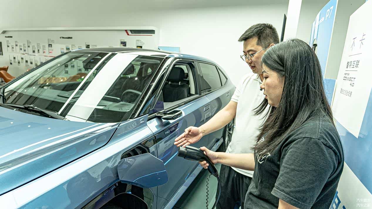 作为品牌的“新星”,广汽本田P7自然备受呵护,不仅被放置在展厅最显眼的位置,而且在展示的物料上,也比其它车型多得多,除了一些宣传展板之外,还有绿植、露营车等陪衬,甚至连头顶还有专属的灯光。所以几乎每组进店的消费者,无论是看油车还是做保养,都不可避免地要多看上几眼。