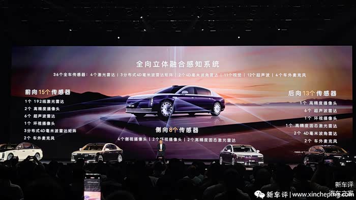 驾驶辅助方面,尊界S800首发搭载HUAWEI ADS 4高阶驾驶辅助系统,全车总计配备36个传感器,包括1颗192线激光雷达、3颗固态高精度激光雷达、3颗分布式毫米波雷达、12颗超声波雷达、2颗角毫米波雷达、3颗高精度摄像头、4颗环视摄像头以及4颗侧视摄像头。系统新增雨雾尘天气防碰撞、负向/悬空防碰撞及极限碰撞主动防护能力。车辆还配备了天使座主动安全防护系统,可在碰撞前自主收紧安全带、升窗、调整座椅姿态并解锁中控锁;碰撞后若低压电池损坏,备用低压电池能维持供电网络正常运行,同时自动拨打救援电话并上报信息。通信方面,车辆提供华为星河通信,支持双网双待、主动智能切换网络,覆盖率提升14%,网络切换时间仅需1.2秒,能够主动预加载地图数据,确保无网隧道导航不中断。