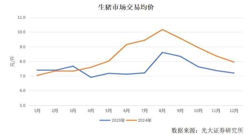 2024年年报中,公司表示,2024 年全国生猪出栏量同比下降3.3%,供给的减少促进猪价反弹,2024 年生猪市场交易均价多数月份高于 2023 年。猪价从2024年5月份开始上涨明显,全年大部分时间高于 8 元/斤,8 月份达到最高点超过 10 元/斤,随后开始回调到年底的 8 元/斤附近。