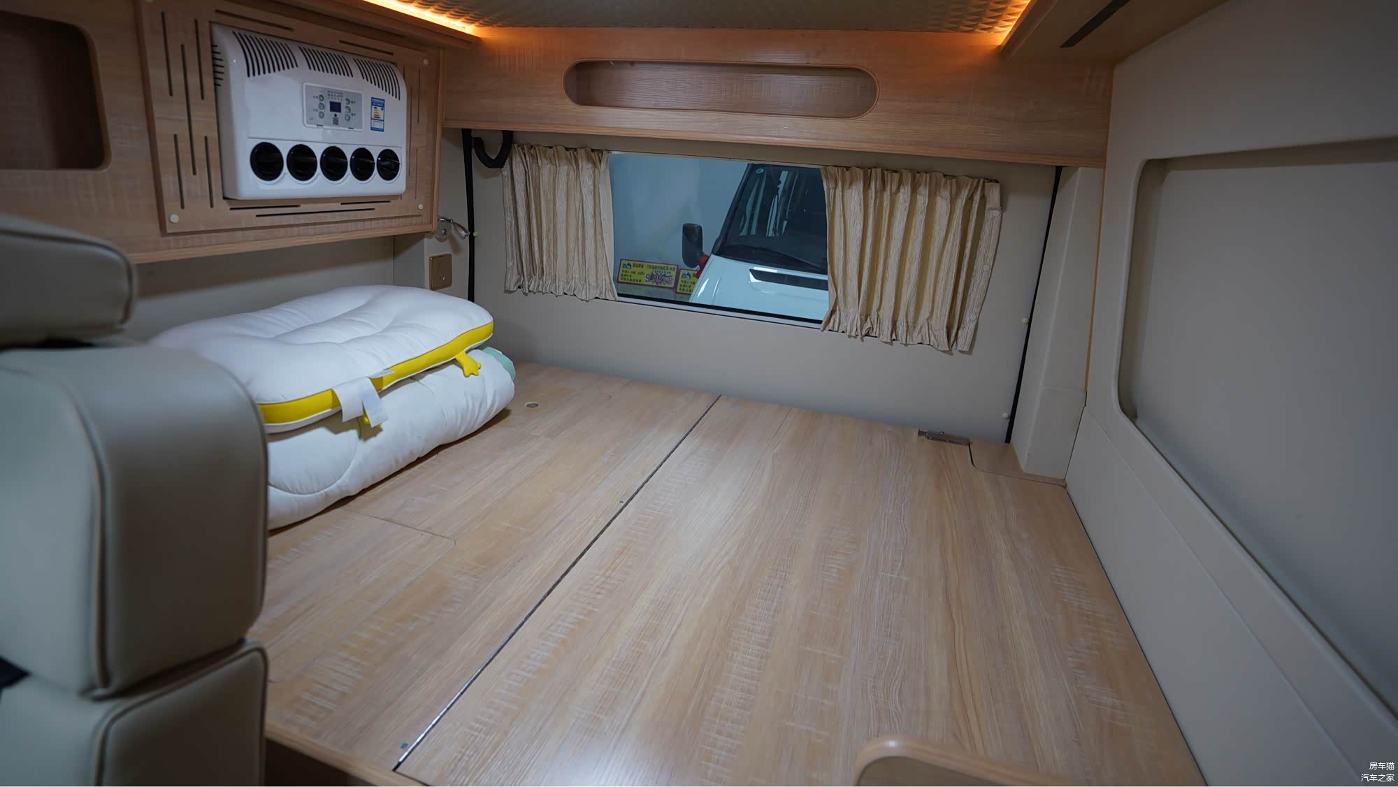 夜间会客区可平铺为一张单人床,后舱横置双人床搭配形成独立私密睡眠区,可满足一家三口的睡卧需求。