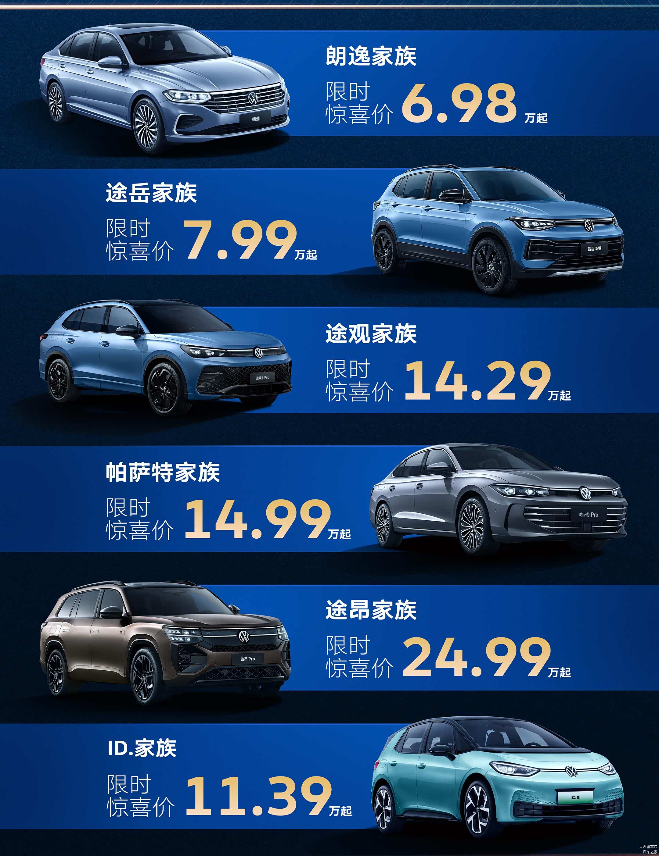 目前,上汽大众朗逸家族最低售价6.98万、途观家族最低售价14.29万、帕萨特家族最低售价14.99万、途昂家族最低售价24.99万、ID.家族最低售价11.39万元。