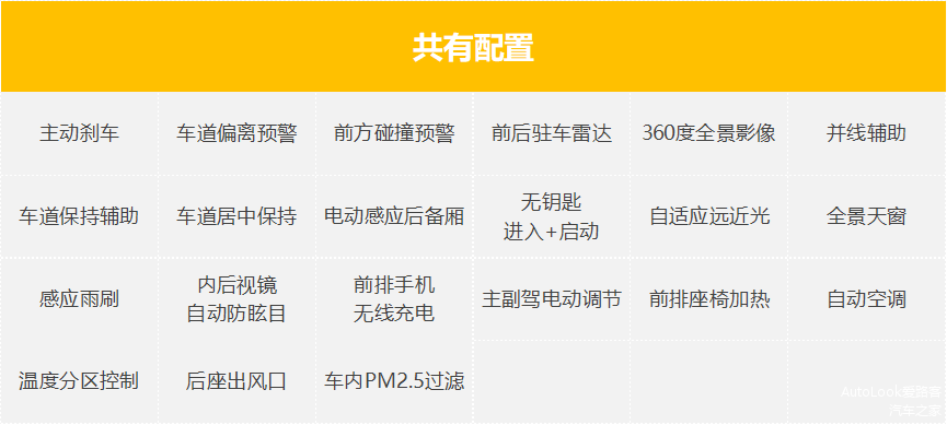 先来看下两车共有的配置,总体还是比较够用的,驾驶辅助功能挺全,舒适性和便利性功能也都到位,像电动感应后备厢、手机无线充电等都是日常会高频用到的。
