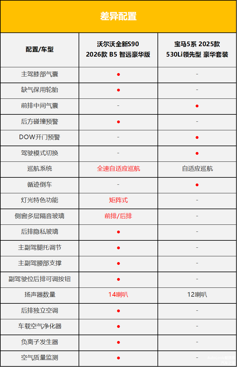配置方面,我们拿各自比较走量的中配车型进行对比,分别是沃尔沃全新S90 2026款 B5 智远豪华版和宝马5系 2025款 530Li领先型 豪华套装。