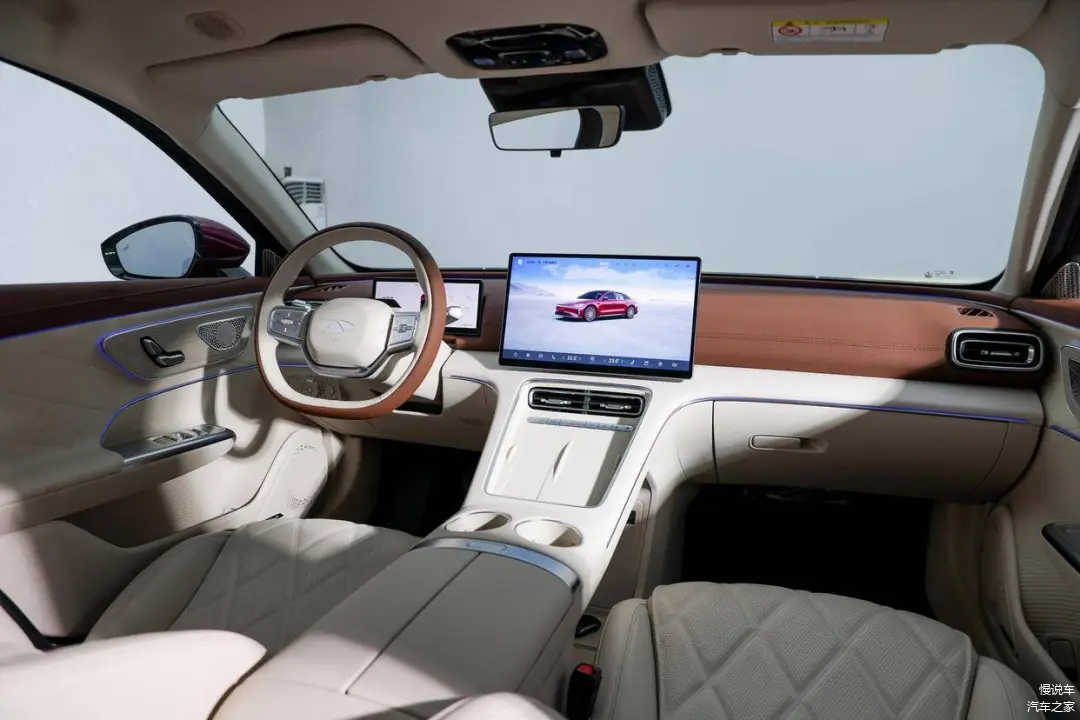 进到车里,最大的亮点就是可能会搭载华为HUAWEI XHUD抬头显示。传统仪表盘被取消了,这个设计思路很大胆。再加上全新自研的"图灵"芯片加持的AI智能辅助驾驶系统,科技感确实没得说。悬浮式中控大屏、隐藏式空调出风口、双手机无线充电、环舱式氛围灯...这些配置一个都没落下。整体内饰看着就是豪华、有档次。智能科技方面,小鹏G7的智能座舱有8295芯片支持,会内置AI 天玑OS 5.6.X版本。而辅助驾驶方面会采用带有高算力芯片支持的纯视觉方案。