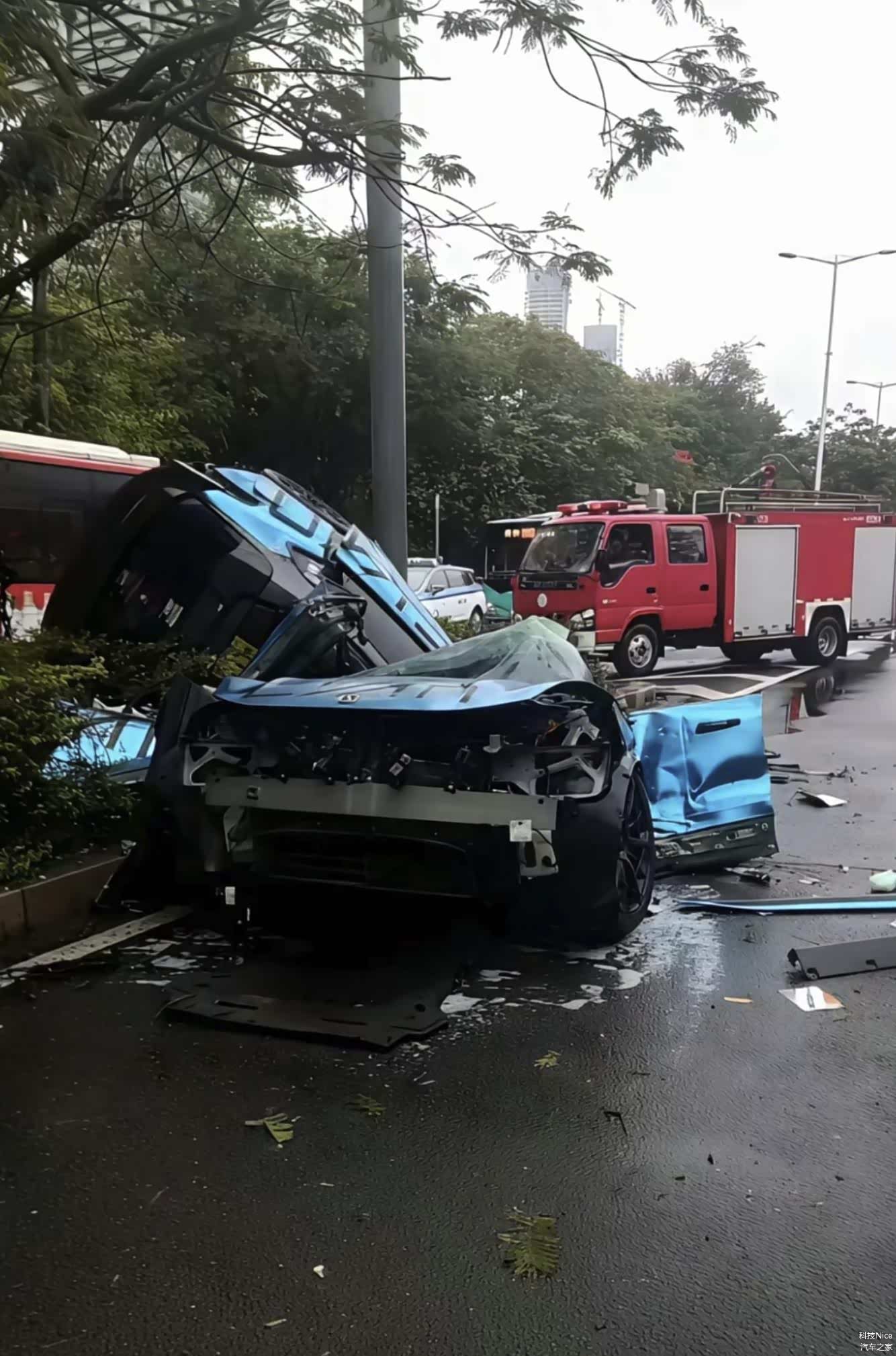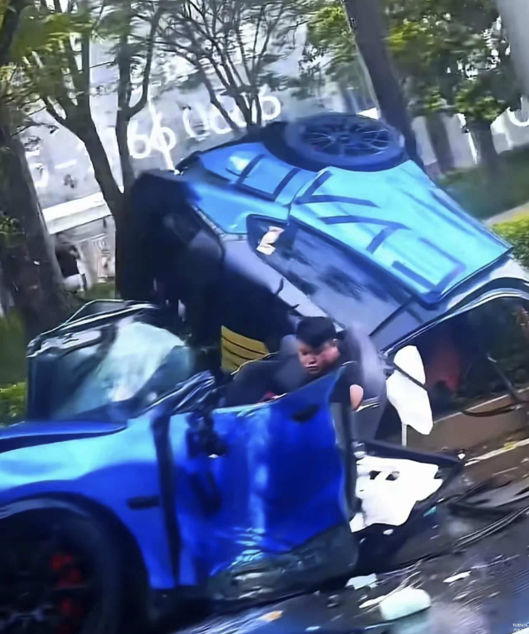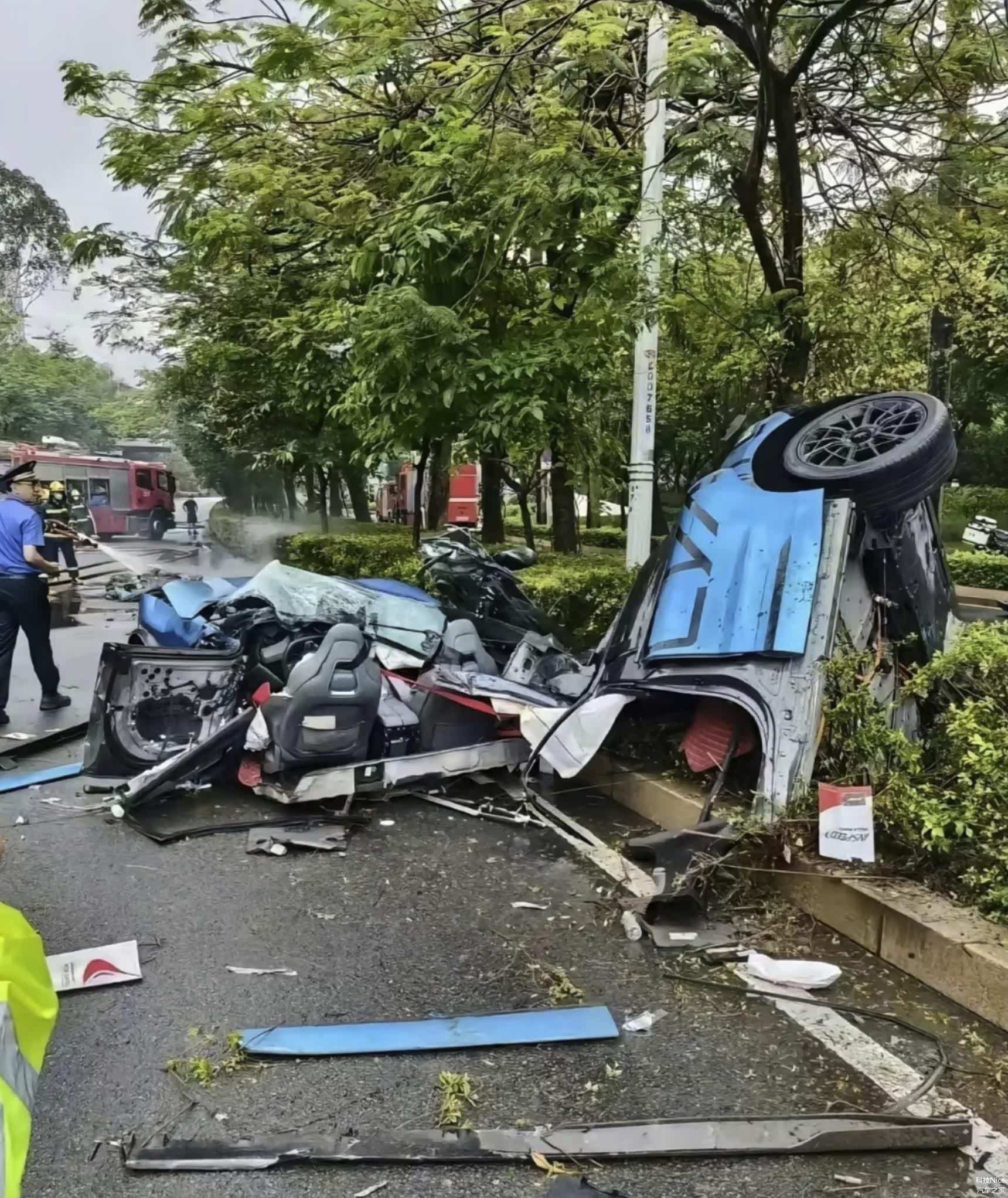 根据现场视频及目击者描述,事故发生时,极氪001 FR以高速撞击路肩,车身在剧烈碰撞中从前排座椅后方断裂为两截,后半部分直接挂上路边灌木丛。