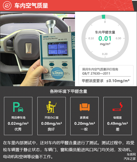 在车内空气质量测试环节,将车辆放置在车辆较少的内部地面停车场中,实测2025款阿维塔06增程版的车内甲醛含量为0.01mg/m3,符合2012年3月1日起实施的,由原环保部和国家质量监督检验检疫总局联合发布的《乘用车内空气质量评价指南》(中华人民共和国国家标准GB/T 27630-2011)中的相关标准。