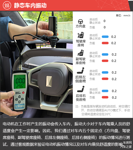 在静态车内振动测试环节,启动后静止和负载两种状态下,2025款阿维塔06增程版方向盘位置的振动数值始终为0,前后排座椅在两种状态下的振动数值均为0.2mm/s,对乘坐舒适性影响不大。