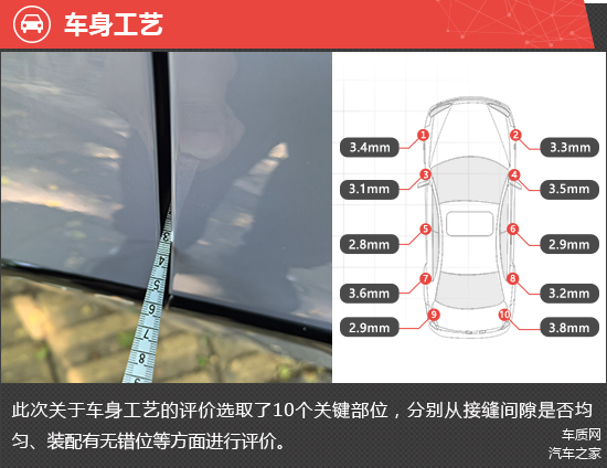 在车身工艺测试环节,整车共选取10个关键部位,每个关键部位都会选取3个关键点进行测量,以评价各关键部位缝隙的均匀程度。从测试结果来看,虽然评测车所有部位的缝隙均值控制在4mm以内,不过后翼子板与后备厢连接处两侧缝隙均值相差较大,对最终测试成绩造成一定影响。