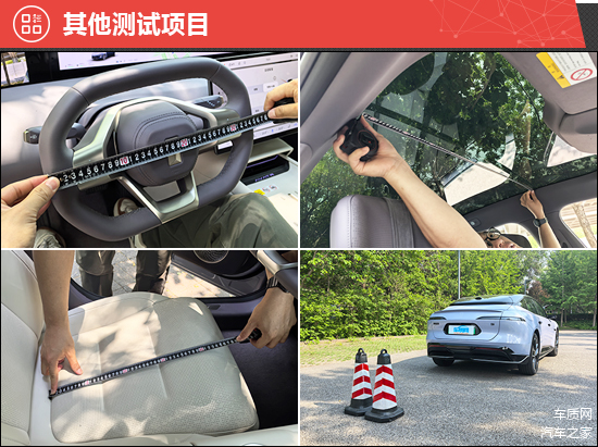 此外,我们还针对驻车雷达、灯光/视野、操控系统、轮胎、天窗、座椅、后备厢进行了测试。经过测试,评测车由于配备了流媒体后视镜,并选装了电子外后视镜,因此在后方视野以及外后视镜视野方面表现出色。评测车配备马牌PremiumContact C系列轮胎,采用新型含硅高分子化合物胎面配方,能够有效减少轮胎转动中的能量损失,降低滚阻,轮胎规格为255/45 R20。相对而言,后排座椅座垫长度未达到同级别车型测试均值,有待优化。