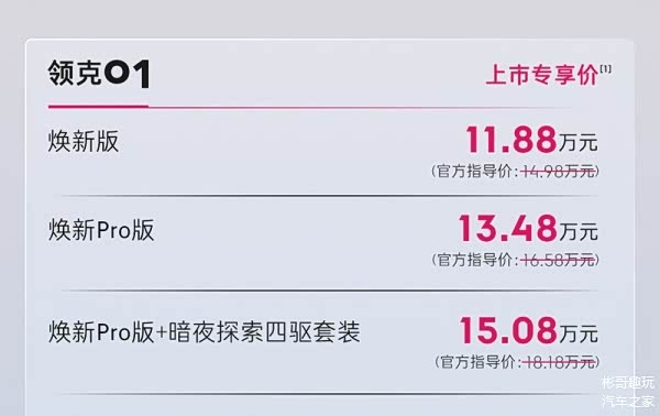 从官方获悉,领克 01 焕新版现已正式上市,此次推出焕新版和焕新 Pro 版,其中焕新 Pro 版可选装 “暗夜探索四驱套装”,官方指导价为 14.98 万、16.58 万、18.18 万元,同时上市专享价为 11.88 万、13.48 万和 15.08 万。领克 01 焕新版在外观细节、座舱设计与功能上进行了升级优化,并推出全新夜影蓝配色,限时选装价 2000 元。官方还表示,即日起至 7 月 31 日前下订领克 01 焕新版,可享受至高 49507 元的上市购车权益(含国家报废补贴 1.5 万)。