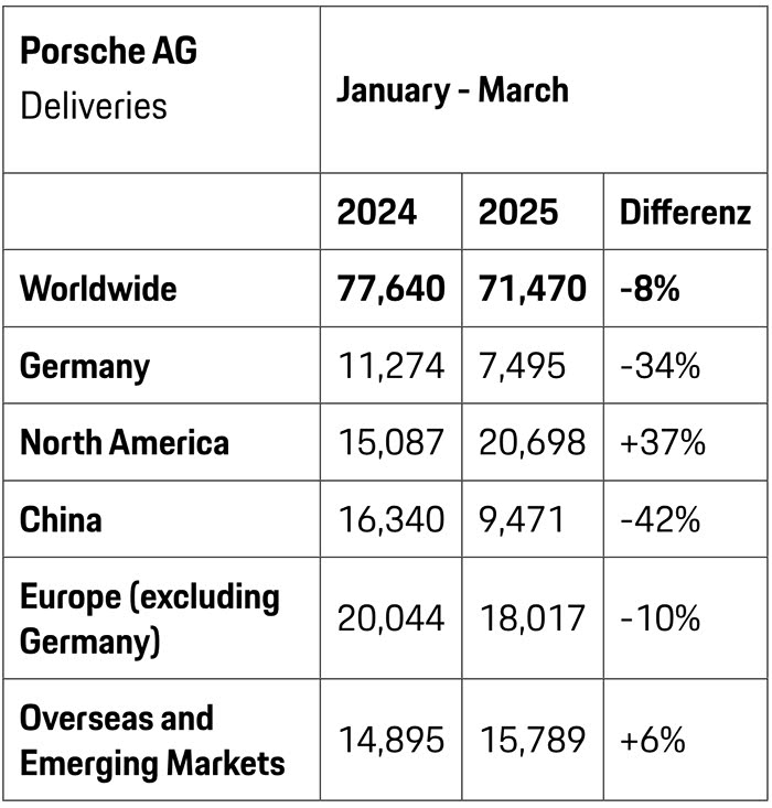 数据显示,2025年第一季度保时捷全球累计交付7.14万辆新车,同比下滑8%,其中中国市场交付量大幅下滑了42%,仅为9471辆,创下近十年最差纪录。回顾保时捷在中国的黄金时代:2021年销量高达9.57万辆,占据全球市场的30%。然而,自2022年起,销量连续三年下滑,2023年,保时捷在华销量下滑幅度进一步扩大至15%,2024年仅剩5.7万辆同比下降3%,而在2025年第一季度更是跌破万辆大关,昔日王者光环正在加速褪色。