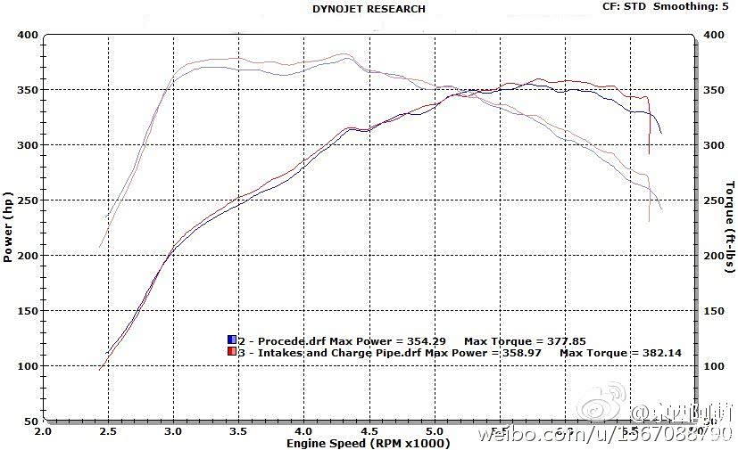 简单的程序加持之后,峰值马力轻松的达到了354匹,并且是整段转速区间都得到了提升,可以看出,程序绝对是涡轮车提升动力的最佳途径。
