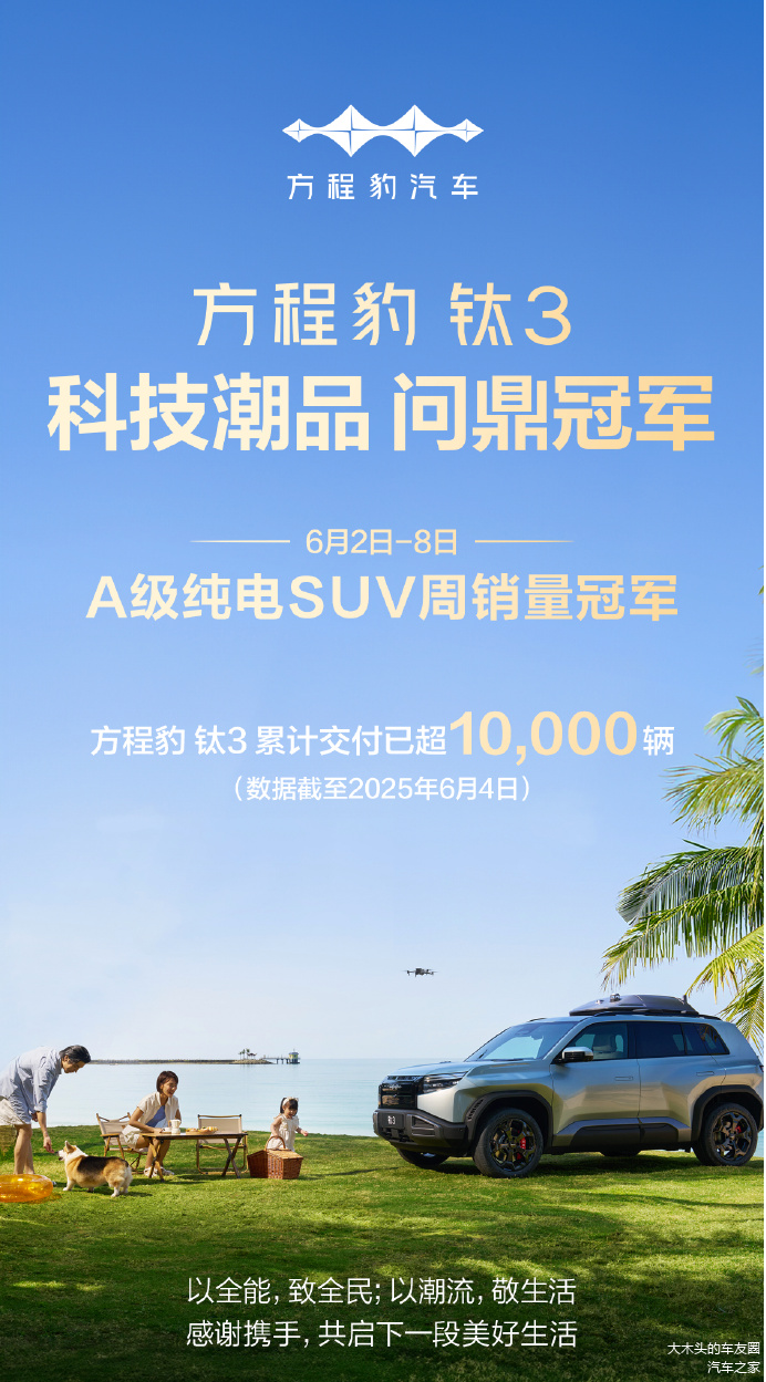 从硬派越野到家用市场,方程豹通过钛3实现了“技术共享降本”与“场景创新增值”的平衡。随着四驱版持续放量,这款A级纯电SUV有望助推方程豹在2025下半年冲击更高位次——毕竟,用一半的价格实现越级体验,永远是市场的硬道理。