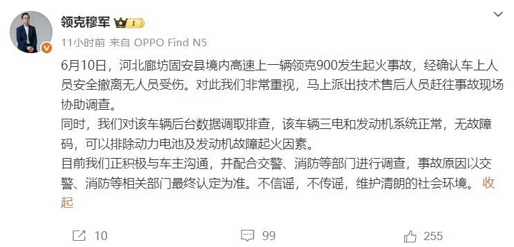 近日,河北固安境内一段高速上出现意外,一辆领克900新车燃起熊熊大火。事发后,领克公司副总经理穆军发文回应。穆军表示:“6月10日,河北廊坊固安县境内高速上一辆领克900发生起火事故,经确认车上人员安全撤离无人员受伤。对此我们非常重视,马上派出技术售后人员赶往事故现场协助调查。同时,我们对该车辆后台数据调取排查,该车辆三电和发动机系统正常,无故障码,可以排除动力电池及发动机故障起火因素。”