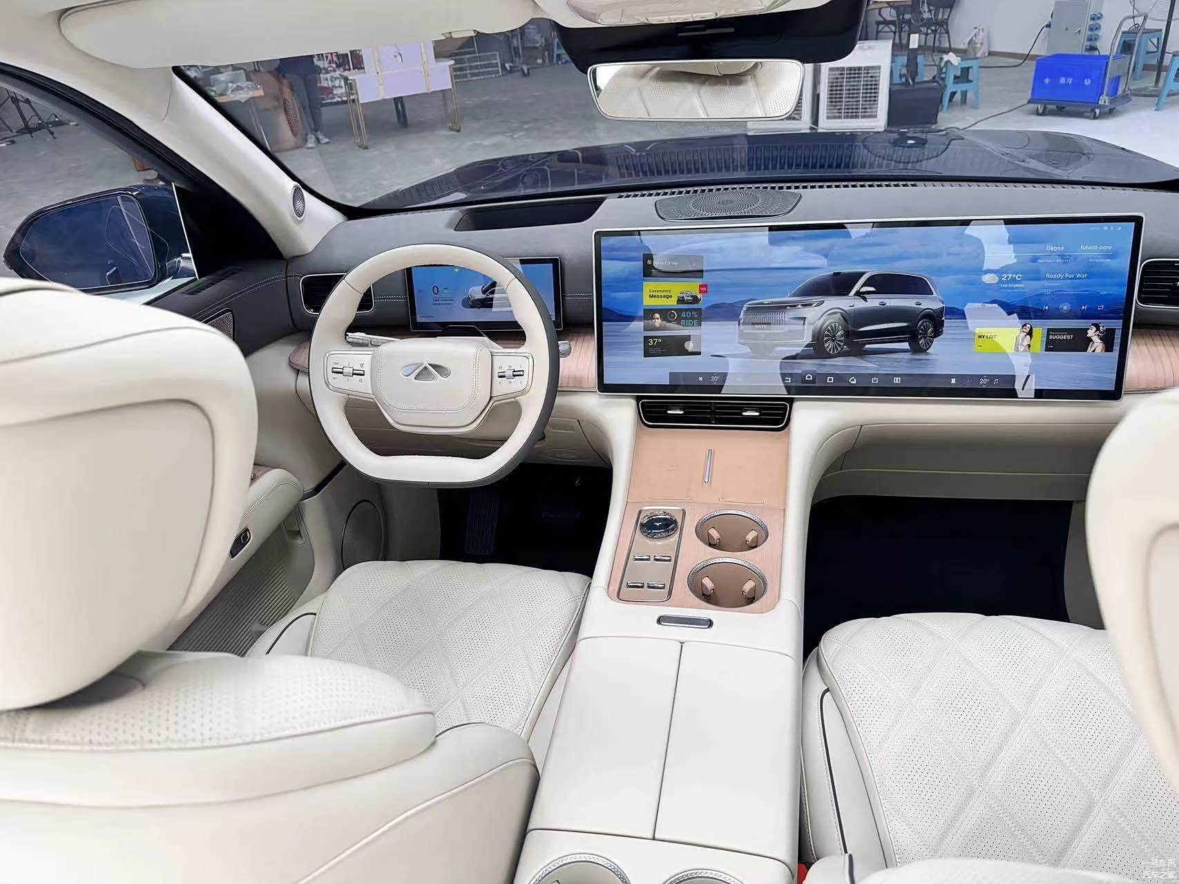 进入车内,风云 T11 的豪华智能座舱令人眼前一亮。30 英寸一体式大连屏搭配悬浮式全液晶仪表,搭载高通骁龙 8155 芯片,操作流畅且功能丰富;平底多功能方向盘集成多种快捷按键,兼顾科技感与实用性。2+2+2 的六座布局专为家庭用户打造,第二排独立 “老板座” 堪称点睛之笔 —— 电动腿托、可折叠小桌板、加热 / 通风 / 按摩功能一应俱全,为乘客带来头等舱级舒适体验。后排 17.3 英寸吸顶电视、三区独立空调与车载冰箱的组合,完美实现 “家庭影院 + 移动办公室” 的场景需求,无论是长途旅行还是商务出行,都能轻松应对。