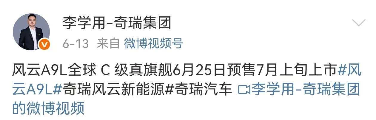 6月13日,奇瑞汽车的副总裁李学用宣布,奇瑞 风云A9L(图片 | 参数 | 询价)计划在6月25日开始预售活动,并预计在7月上旬正式进入市场,上市后的交付概率相当高。