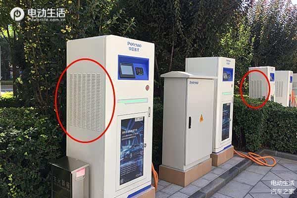 走到充电桩的侧面你还会发现,高电压充电桩比更厚,侧面有7排散热孔。低电压充电桩薄,侧面只有四排散热孔。当然,除了这两种方法之外你还可以看充电桩后面的铭牌,不过就我们拍摄的电桩来看,后面是绿化,根本看不到。