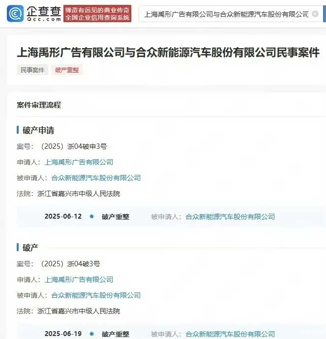 曾经的造车新势力一哥,最终可能还是无法逆天改命。电驹小编从企查查APP了解到,哪吒汽车关联公司即合众新能源汽车股份有限公司被申请破产一案更新,6月19日新增破产案件,管理人机构为浙江子城律师事务所,经办法院为浙江省嘉兴市中级人民法院。此前,申请人上海禹形广告有限公司已对该公司提出过破产审查。