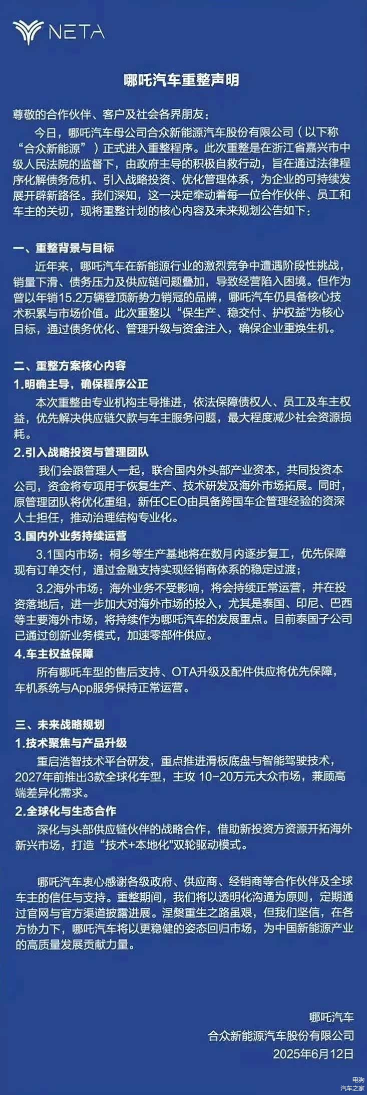 据上述员工发出的公告显示,哪吒汽车宣布其母公司合众新能源汽车股份有限公司正式进入重整程序。