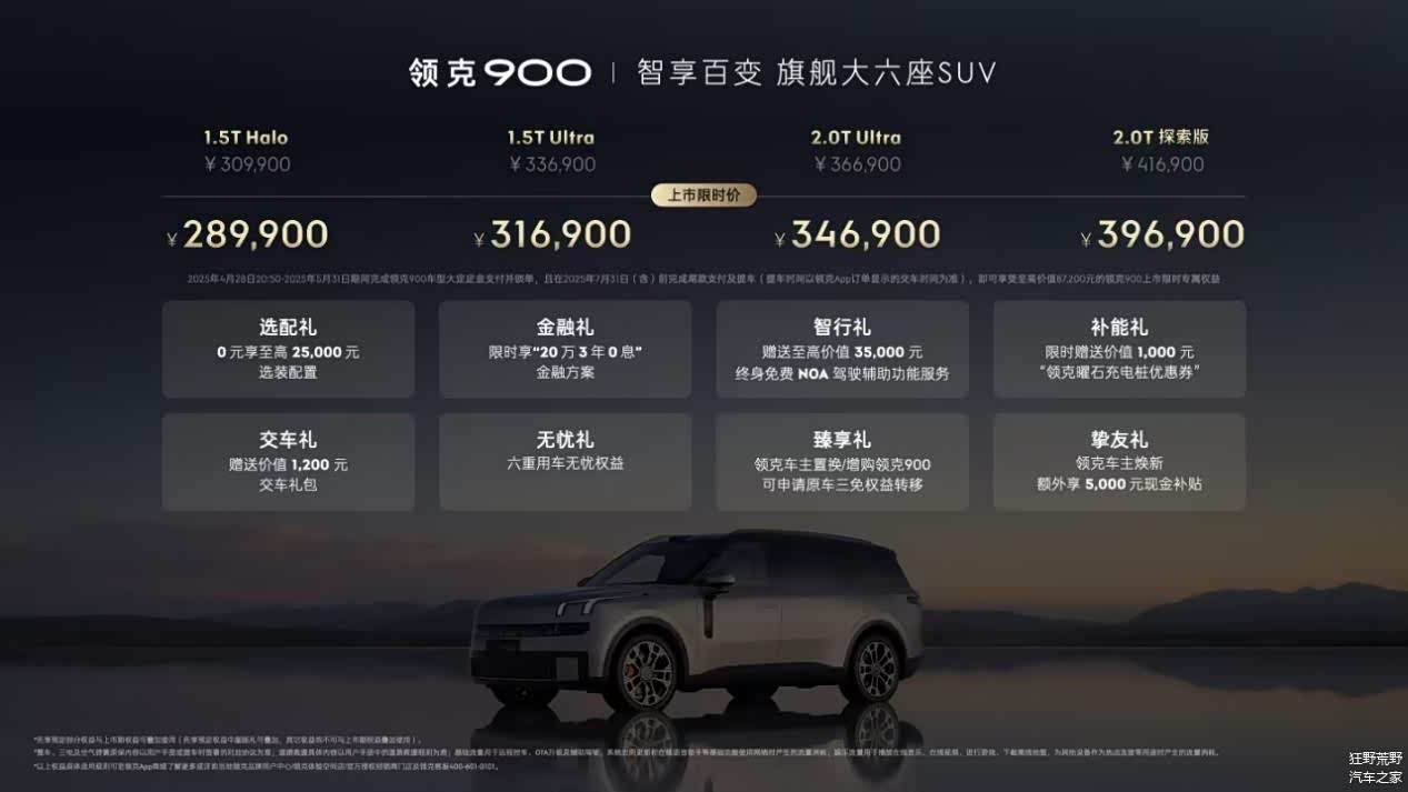 2025年4月28日,领克汽车正式推出全新旗舰车型——领克900,以“智享百变旗舰大六座SUV”的定位,树立了大型家用SUV市场的新标杆。此次上市,领克900共推出1.5T Halo、1.5T Ultra、2.0T Ultra、2.0T探索版四大配置,限时售价28.99万元至39.69万元,旨在满足不同家庭的多样化需求。