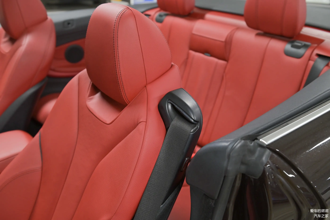 而且敞篷4系还有个很好的点,在于前排座椅的安全带集成在座椅本体上,对我这种胳膊短的小个子非常友好,系的时候不用费劲去后面拉。4系的后排本来空间就还不错,敞篷版本没了车顶之后,其实进后排会更加友好,不用弯腰蜷身。弹跳不错的朋友甚至可以直接蹦进去。