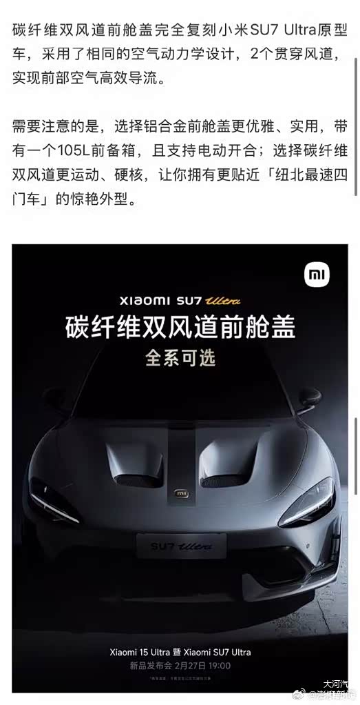 今年年初,小米在宣传SU7 Ultra车型时,着重介绍其选装的4.2万元碳纤维双风道前舱盖,称其“复刻原型车双风道设计”“双风道直接导向轮毂,支持轮毂散热”,小米创始人雷军更强调该部件“结构全改”。这些宣传让不少追求高性能与独特设计的消费者心动。