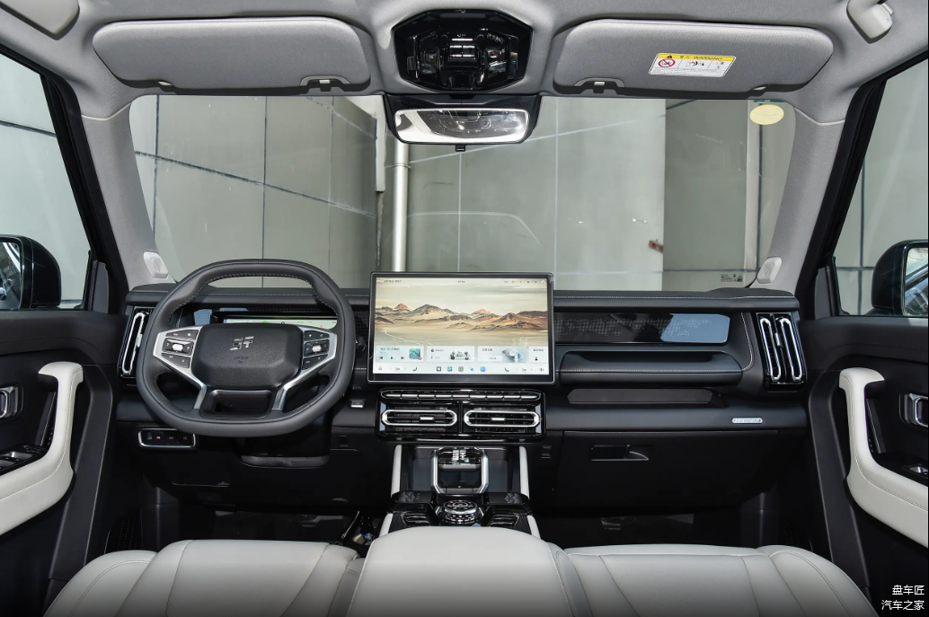 车身侧面看上去也是比较的硬派,此外分段式的腰线设计也带来不错的力量感。但车侧与车尾的轮廓让人联想到路虎卫士,既有实用性,又带有一丝冒险的气息。还提供了传统车门外把手避免低温环境下隐藏式把手的冻结故障,固定式上车踏板承重达 300kg,适配各年龄段乘客;车顶承重式行李架可加装拓展装备,官方测试显示满载荷下行驶稳定性不受影响。并取消了尾部的小书包,让整车造型在视觉效果上简洁大气的同时,又不失越野的硬派气质。总的来说,山海T1还是比较符合市场的主流审美。