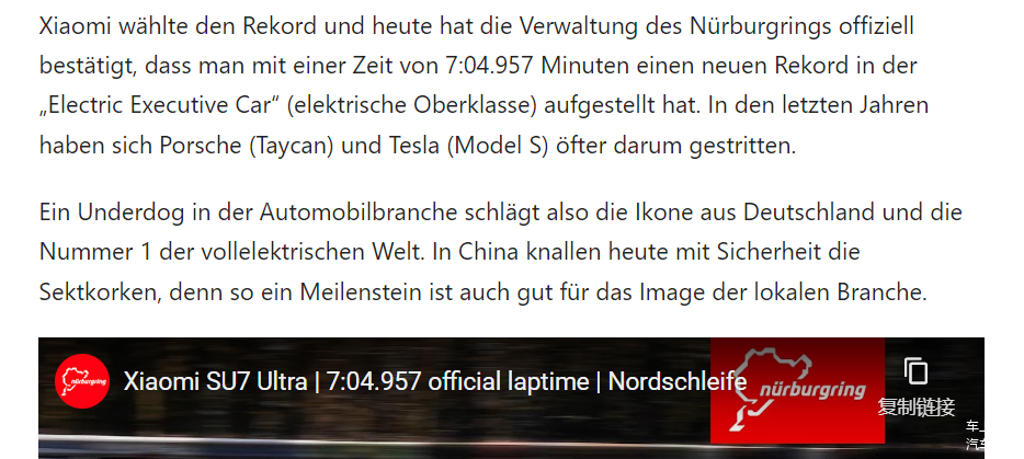 SU7 Ultra刷新纪录后,一家德国媒体如此评价:“就这样,一个汽车行业的后来者击败了德国传奇品牌和全球纯电领域的领头羊。今天中国国内必定香槟四溅,因为这样的里程碑事件对本土汽车行业的形象也大有裨益。”