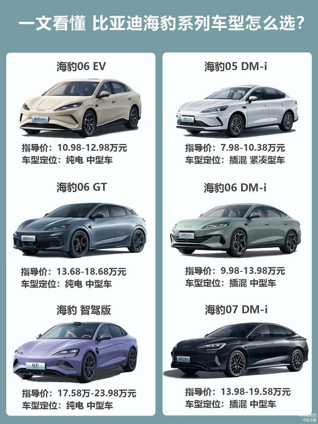 近日, 海豹(图片 | 参数 | 询价)06 EV上市,海豹系列产品进一步丰富,面对覆盖7-24万价格区间的6款车型,消费者常陷入选择困境:名字差不多到底有什么区别?选纯电,还是插混?追求入门级性价比,还是进阶性能体验?本文就来一起关注