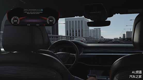 当系统检测到车速超过60km/h后,此时已脱离拥堵路段。Audi AI会有8~10秒的缓冲时间,提示驾驶员接管汽车。若10秒后驾驶员依旧未接管汽车,系统处于安全的考虑,会缓慢减速,直到停止,并打开双闪灯。