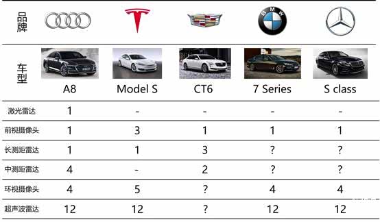 以下是市面上几款拥有自动驾驶功能汽车的传感器配置对比图: