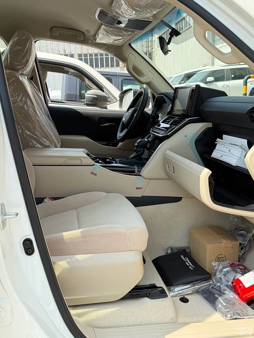 高低速四驱、黑色后视镜、脚踏板、4.2寸显示屏、冰箱、7座、绒布座椅、真皮多功能方向盘、脚垫、底挂备胎、拖钩。