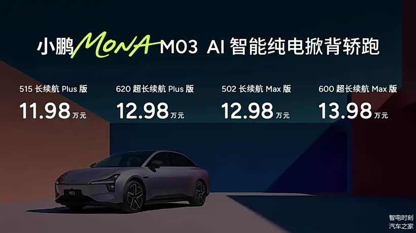 小鹏Mona M03的指导价价在11.98-13.98万元区间,属于新势力中的性价比选手,目前没有什么优惠政策,但后期购车成本可能会因电池衰减、软件付费等问题增加。