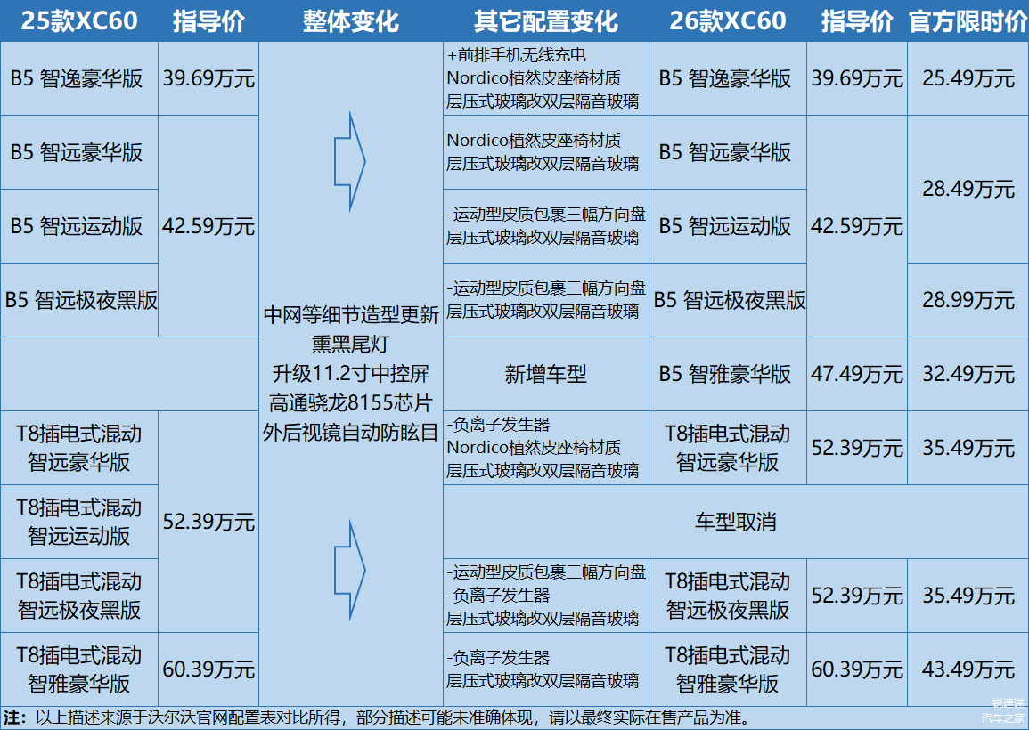 附:2026款沃尔沃XC60官方配置表(点击下图可放大观看):