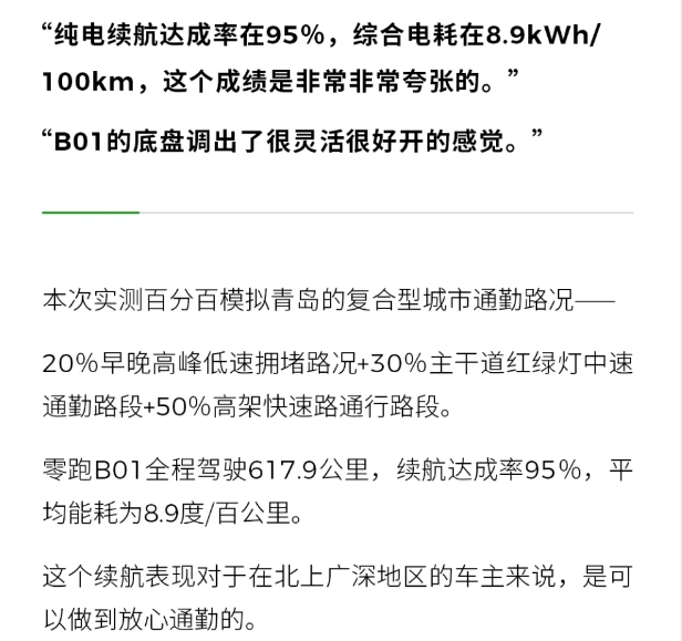关键是在27合1超级集成热管理系统、全系标配热泵以及低至 0.197Cd的整车风阻系数的加持下,令零跑B01拥有了更低的能耗和更高的续航达成率,在B01全国动态巡游青岛站,就有权威媒体测出了8.9度/百公里的真实能耗和95%的续航达成率。