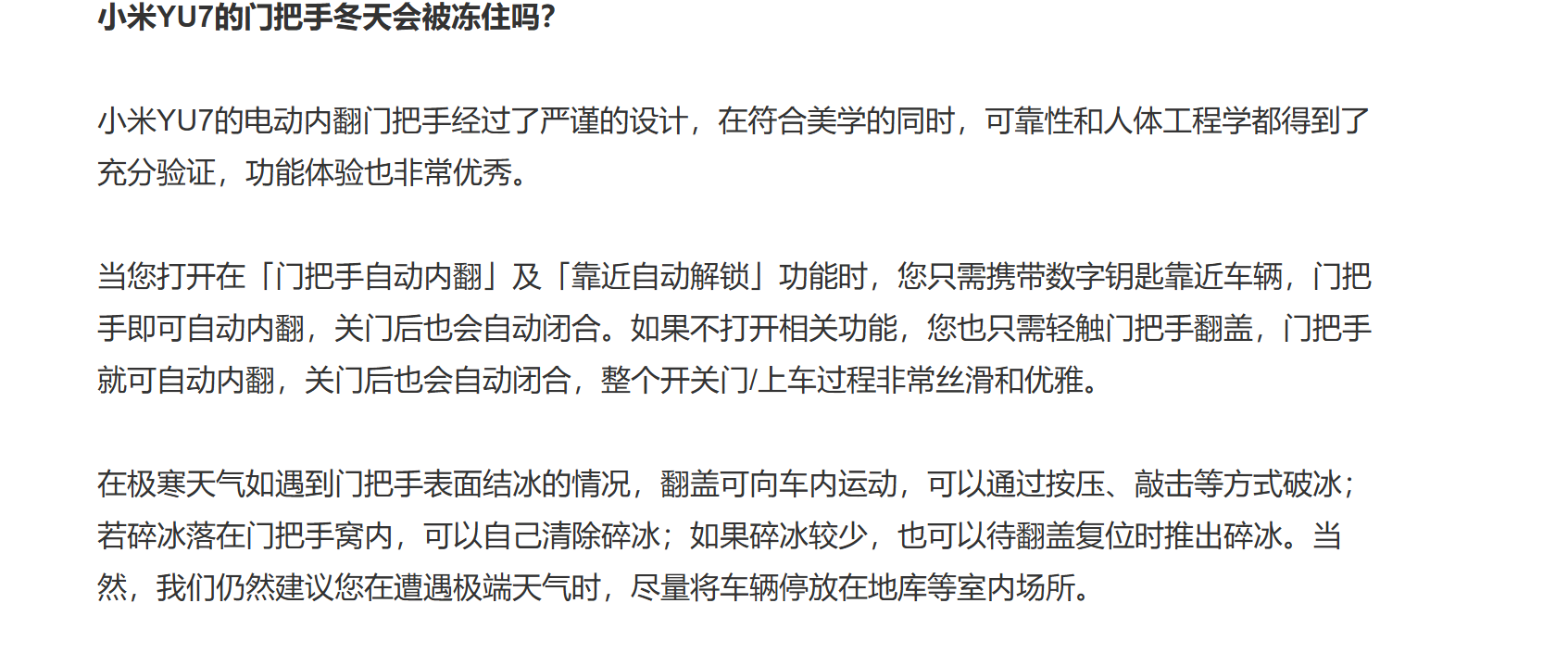 用了全隐藏式的小米YU7,门把手盖板并不完全依赖电动开启和闭合,可以手动把盖板往里面翻。其次门把手有两种解锁方式,常规情况下是电动,在发生碰撞后会变成机械解锁,并且对于冬天场景也做了相应优化。