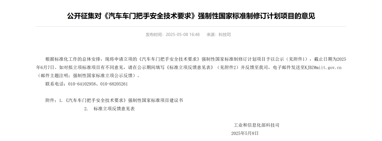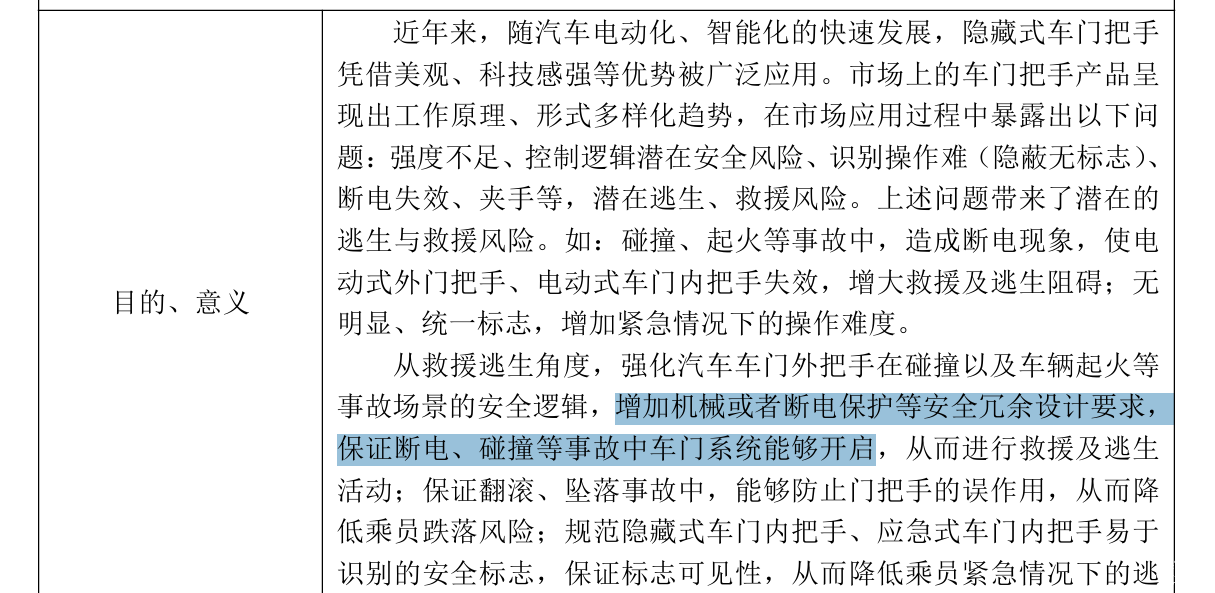 早在今年5月份,工信部已经公开征集了关于门把手强制国标的修订意见,除了要求车内门把手要有明显和易于识别的标志外,最重要是要求增加机械或断电保护等安全冗余设计,就算断电了,也要保证车门能打开。其实之前也有行业标准(QC/T 988-2014、QCT1211-2024)对门把手的要求,主要针对开启力度大小、耐久性等方面,但都只是推荐性标准,跟强制性国标的执行力度没法比。