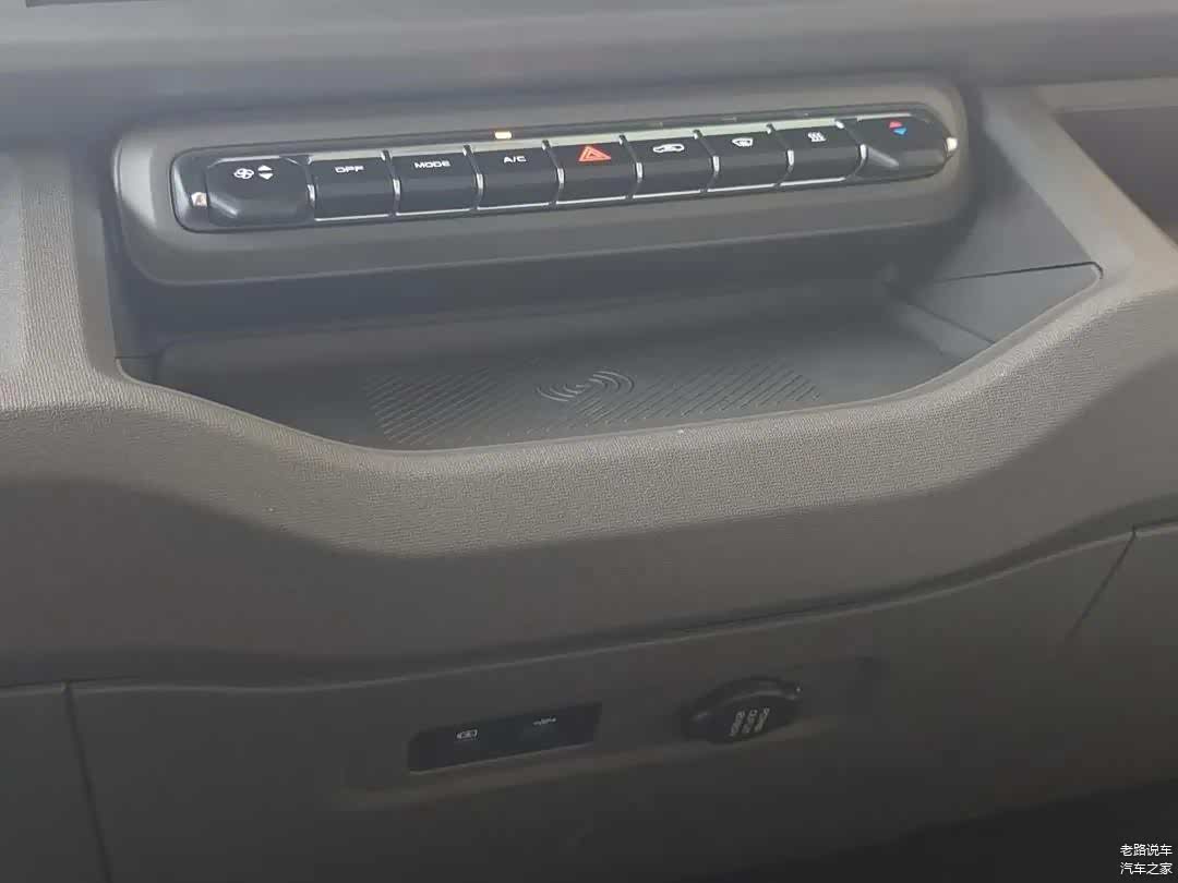 中控大屏下方保留了物理空调按键,便于人员快速操作,底部设有USB充电口和12V电源。