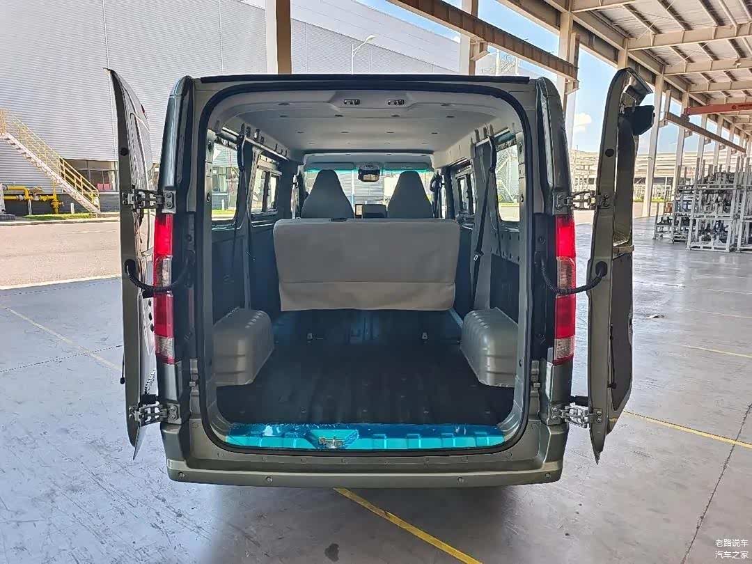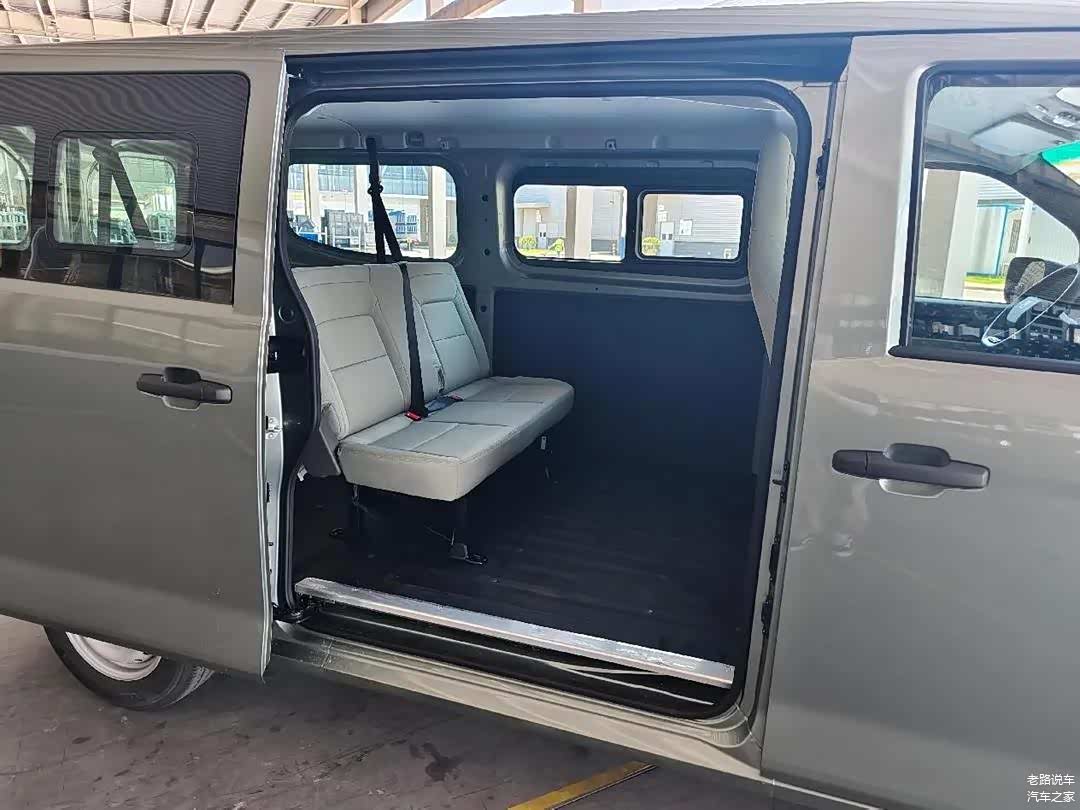 车厢内长2870mm,内高1475mm,容积7.5m3。客运版车型有5、6、7、9座布局,后排座椅支持等比例放倒和全平放倒。上图为货运版盲窗车型,驾驶室隔板下方可以看到预留的开口,打开后可满足4.1m超长管材装运需求。