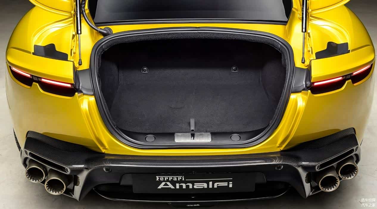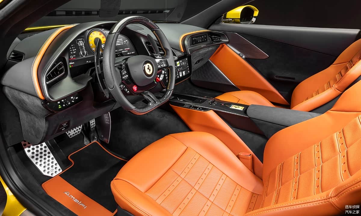 Amalfi的内饰设计和SUV车型Purosangue接近,主驾和副驾区域被中控与门板隔开,铝合金中控台采用整块CNC加工铝块打造,内嵌无线充电、金属换挡结构和功能按键,更多的机械按键取代了触控屏,方向盘保留经典物理拨轮、“Start”铝制点火按钮和音量旋钮。椅也有一些变化,提供三种尺寸可选,选装的舒适型座椅配有10个按摩气囊,支持5种按摩与三挡通风加热,这在跑车上并不多见。