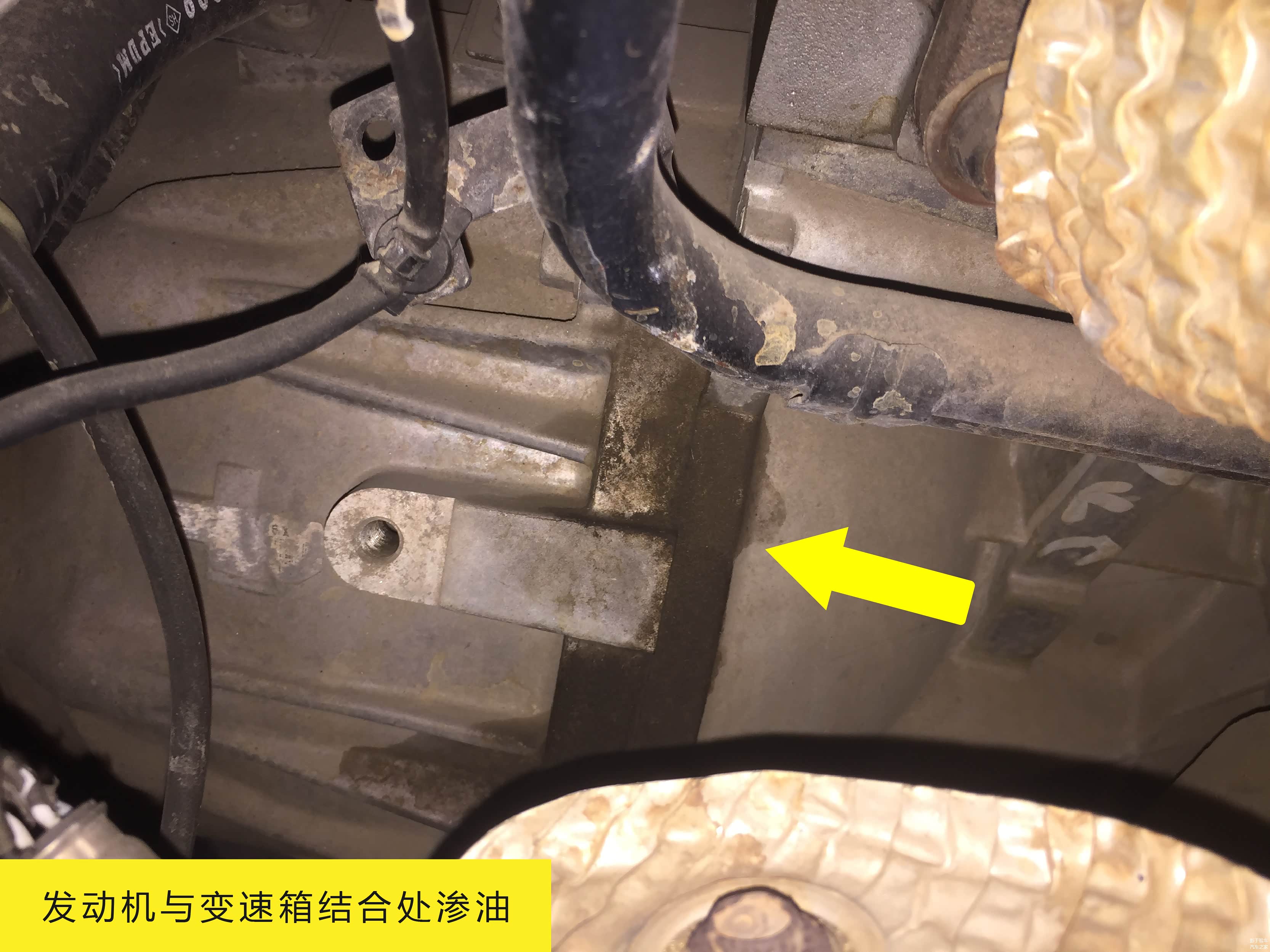 车辆的发动机与变速箱结合处出现渗油,这种图片其实是从发动机舱的后部拍的,所以很多机舱宽大的车型也能看到这个位置,希望大家买车的时候多多留意。