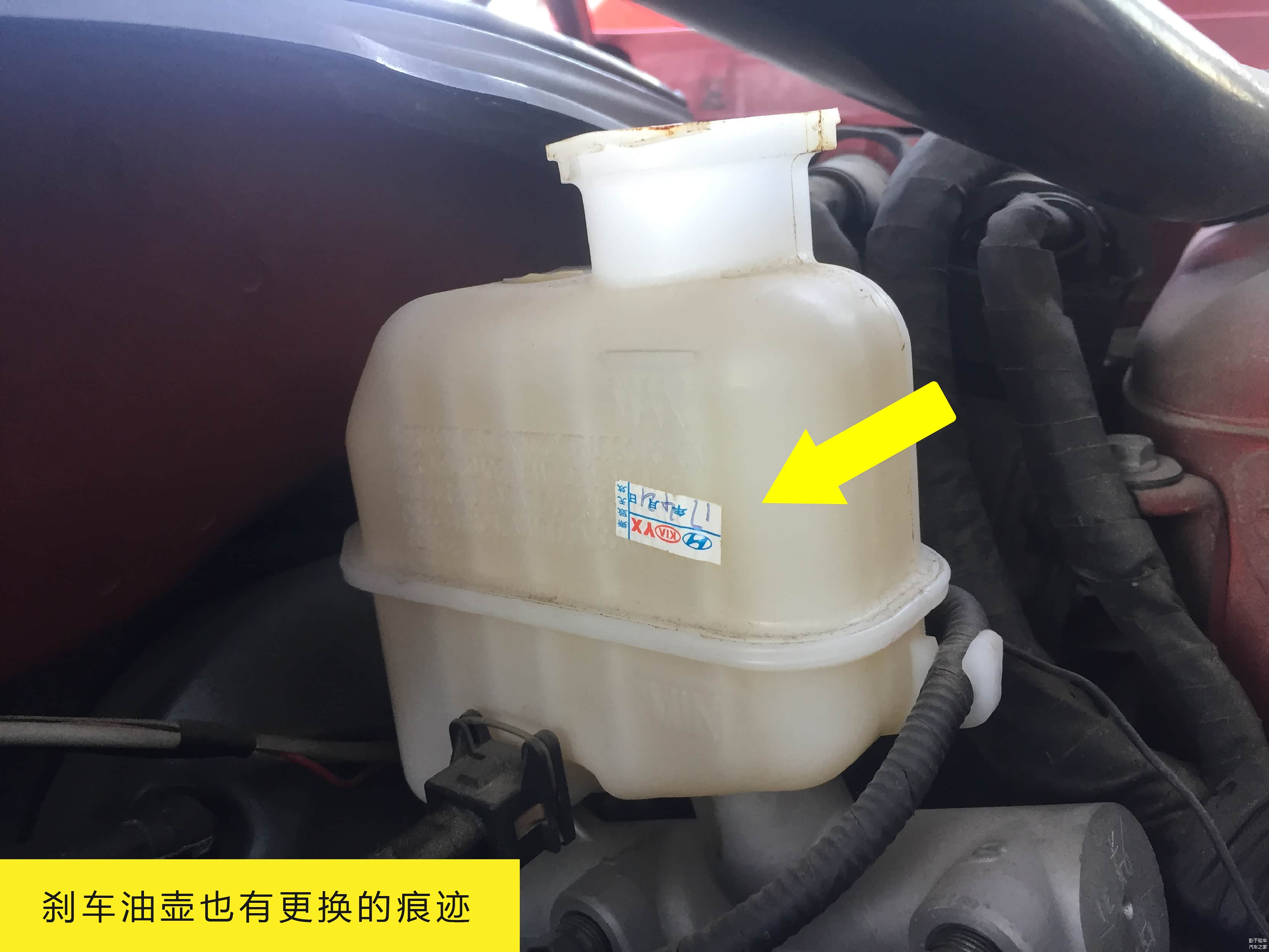 其实看到上图这些痕迹时我也是有点懵X,所以只能通过“套路”卖家来得到一点信息了....还好今天的卖家还算年轻(城府不深),我特意大声的跟客户说刹车系统全部更换过,以此来吸引卖家的注意。他无意间说出了“在对车辆保养时,维修工误把助力油加到刹车油壶里”。虽然只是他漫不经心的一句话,但却有着他不知道的严重隐患。