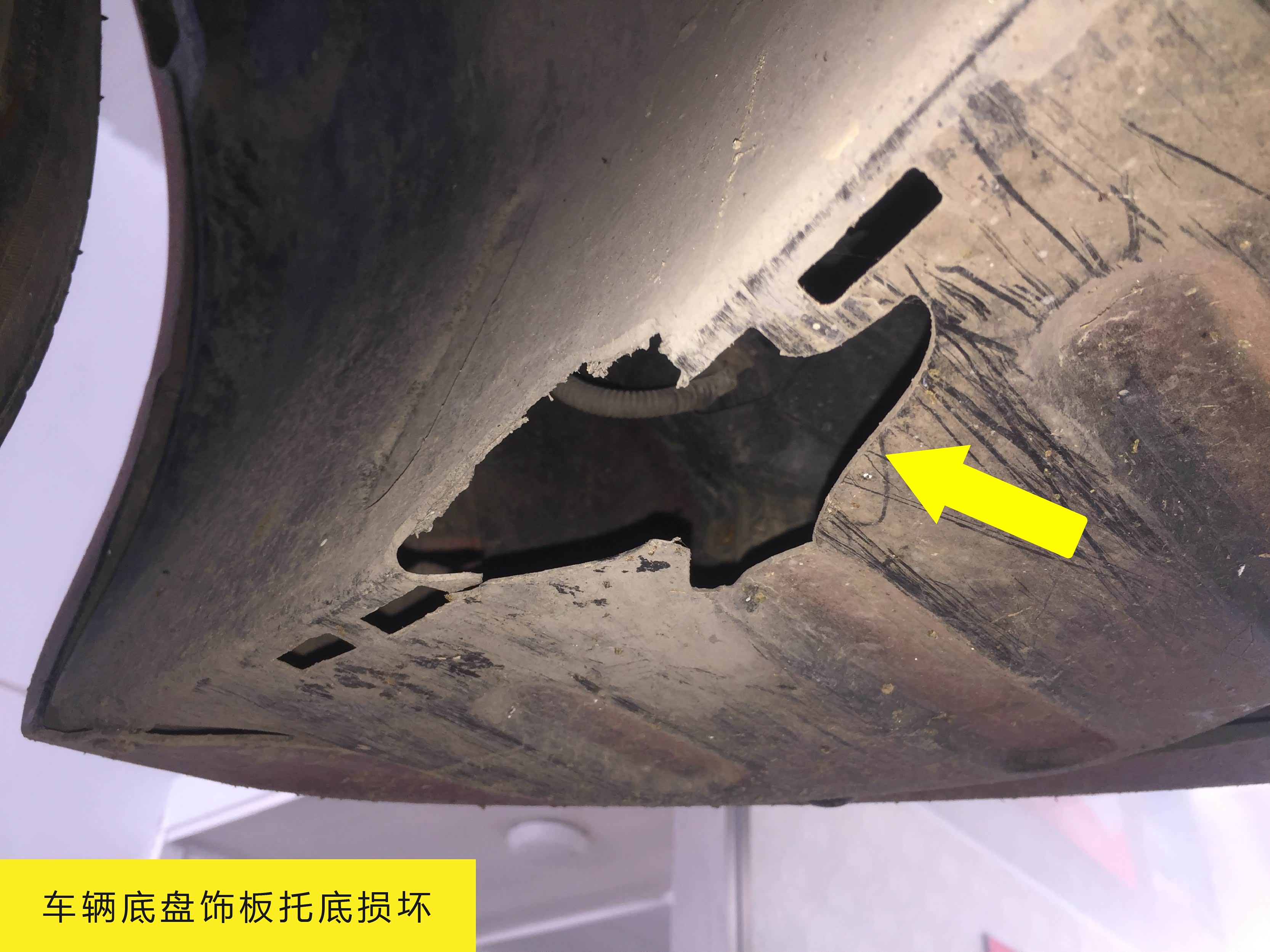 刚抬升底盘,就能看到饰板有拖底损坏痕迹,但不影响车辆正常使用没有维修的必要。