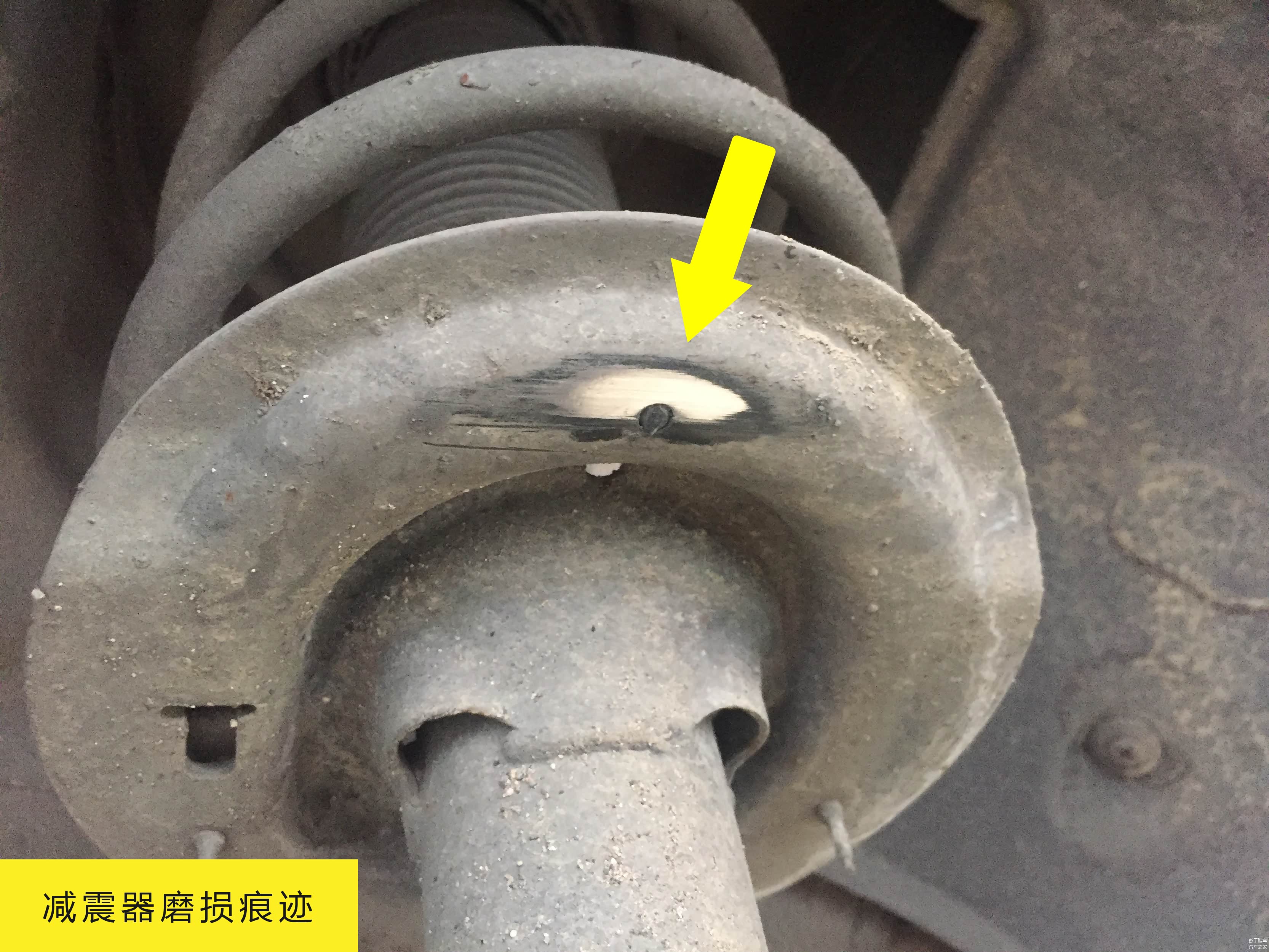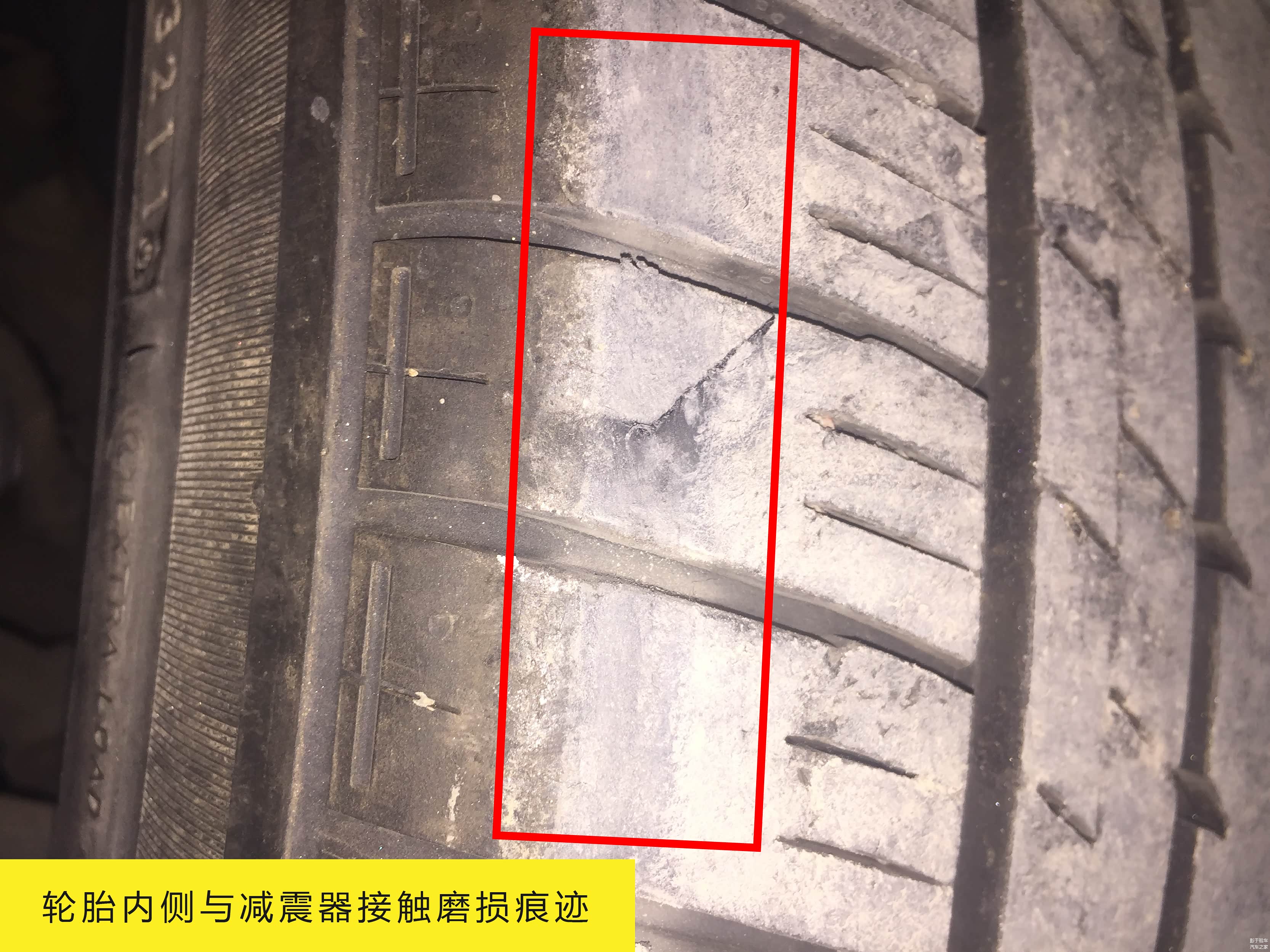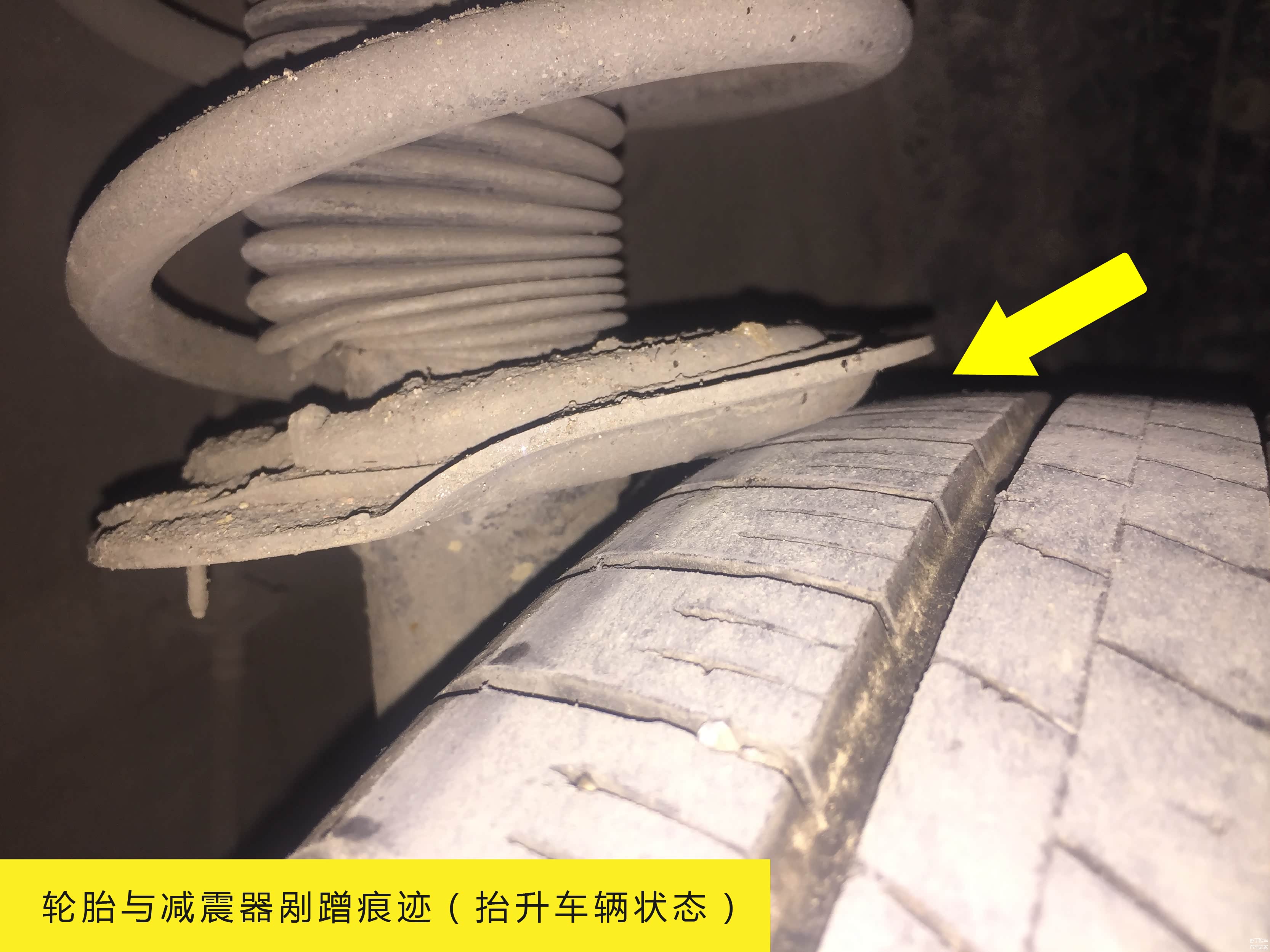 发现车辆的前两条轮胎都与减震器发生刮蹭,所以只能拆卸将前后轮进行对调试试看,结果还是相同(剐蹭)。