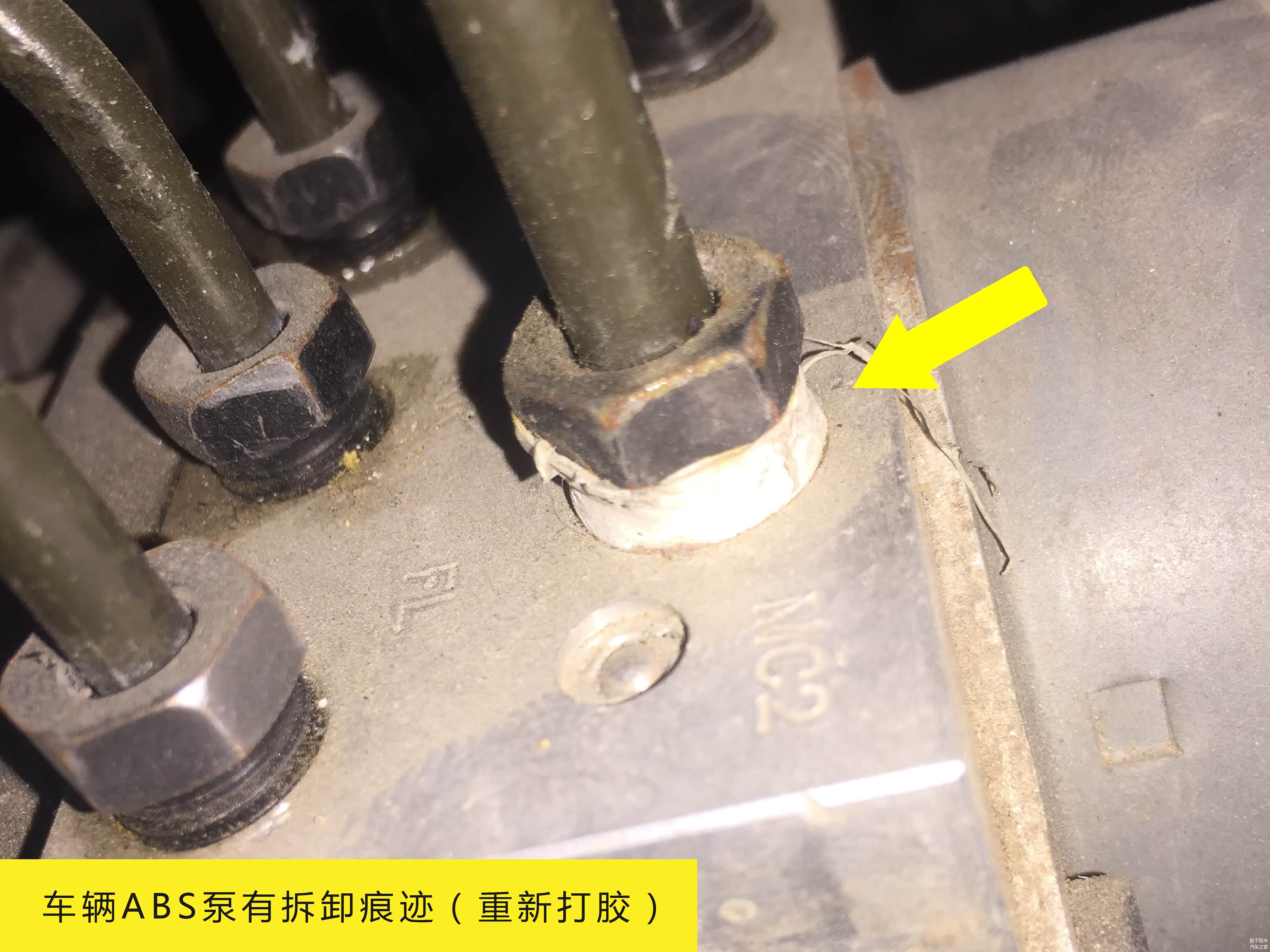 车辆的ABS泵其中一个接口有拆卸重新封胶痕迹,说明最起码ABS也存在隐患并且维修过。